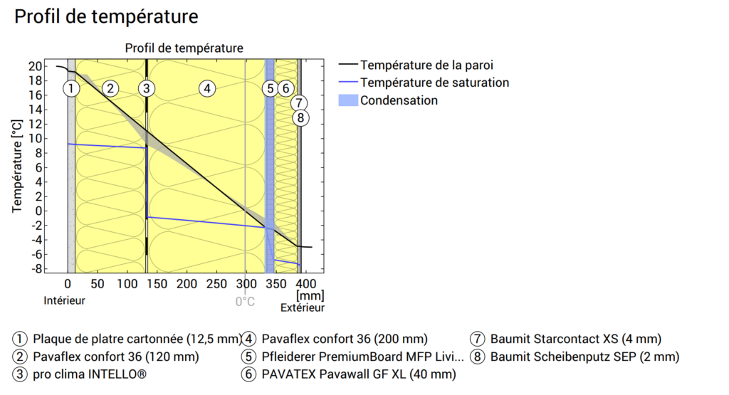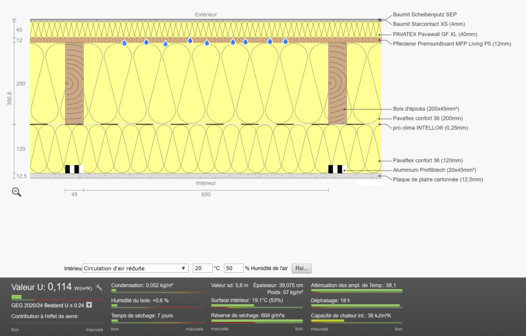 dans le choix de matériaux d’isolation, par exemple d’un mur ossature bois avec une isolation par l’extérieur de 40mm